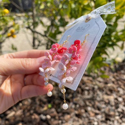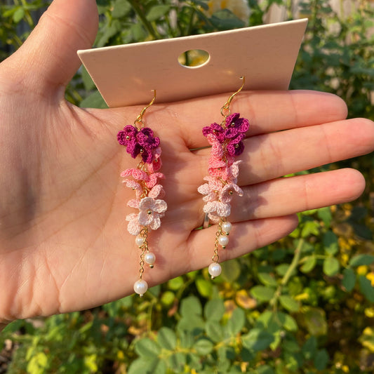 4 shades of Pink ombre flower cluster crochet dangle earrings/Microcrochet/14k gold/gift for her/Knitting handmade jewelry