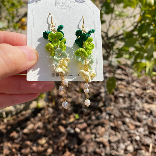 4 shades of Green ombre flower cluster crochet dangle earrings/Microcrochet/14k gold/gift for her/Knitting handmade jewelry