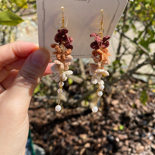 4 shades of Brown and Beige ombre flower cluster crochet dangle earrings/Microcrochet/14k gold/gift for her/Knitting handmade jewelry