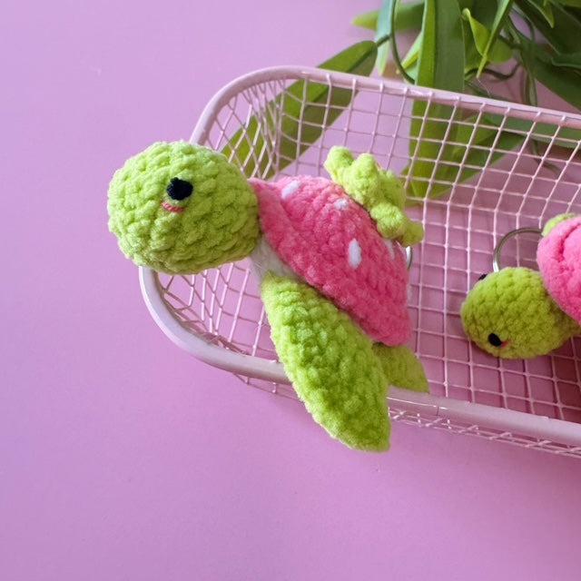 🍓 Pink Strawberry Shell Sea Turtle Crochet Keychain